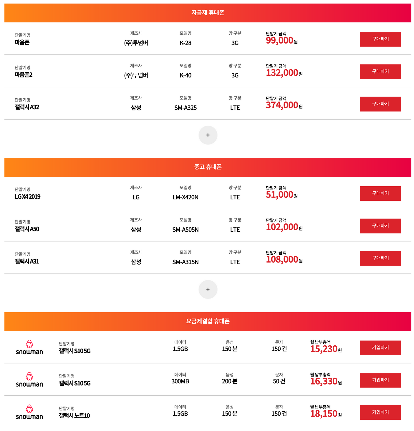 요금제 외에도 휴대폰 기기와 함께 구입 시 비용도 검색이 가능하며, 구입도 가능합니다.